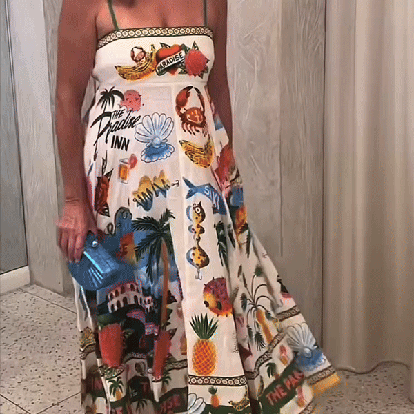 Crafted from lightweight and airy fabric, this dress flows gracefully with every step, creating a mesmerizing silhouette. The abstract colorful art adds a burst of creativity and personality to the ensemble, making it a true statement piece. With its midi length and relaxed fit, it offers both comfort and style for any occasion. Whether you're strolling through a garden party or dancing the night away, this dress promises to turn heads and inspire awe.